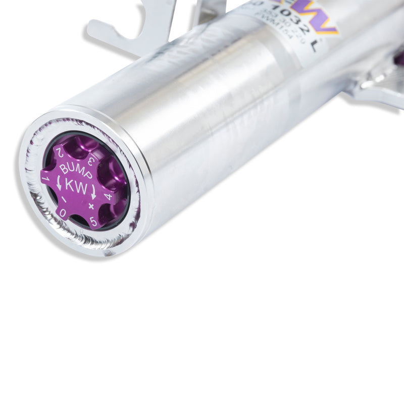 Cutting-edge motorsports technology -or more performance on the road. Like every suspension product developed by KW automotive and manufactured in Germany, the KW Variant 3 Coilover suspension kit also provides a significant improvment on the road. Thanks to the high-quality dampers, springs, and elastomer spring elements, pitching and rolling movements during load changes such as evasive maneuvers, cornering, acceleration, and braking are significantly reduced. The braking distances are also shortened. Thanks to improved support and feedback, drivers not only feel more confident but driving in everyday life is improved. With compression and rebound stage damping, that can be set separately and independently of each other, the damper setup can be customized to your personal driving preferences or vehicle changes such as weight, tire characteristics, or altered vehicle rigidity. True performance optimization is only possible with this unique, patented system. For example, this allows the compression damping force to be increased and get more grip from the tires, to improve cornering behavior and reduce squat without simultaneously altering the rebound stage damping which is optimally matched to the spring rate ? a scenario which results in reduced grip and the associated loss of performance. The KW Variant 3 INOX-LINE coilover kit is the ideal tool for performance-oriented drivers and experienced tuning enthusiasts who place a strong emphasis on the overall performance of their suspension. The Variant 3 features patented TVR-A and TVC-A technology -hat provides separately adjustable rebound and compression damping. The extensive Adjustment -ange of the independently configurable rebound and compression make it easy to directly influence the steering behavior, directional stability, grip and handling characteristics for confident and repeatable results at the limit of driving dynamics.