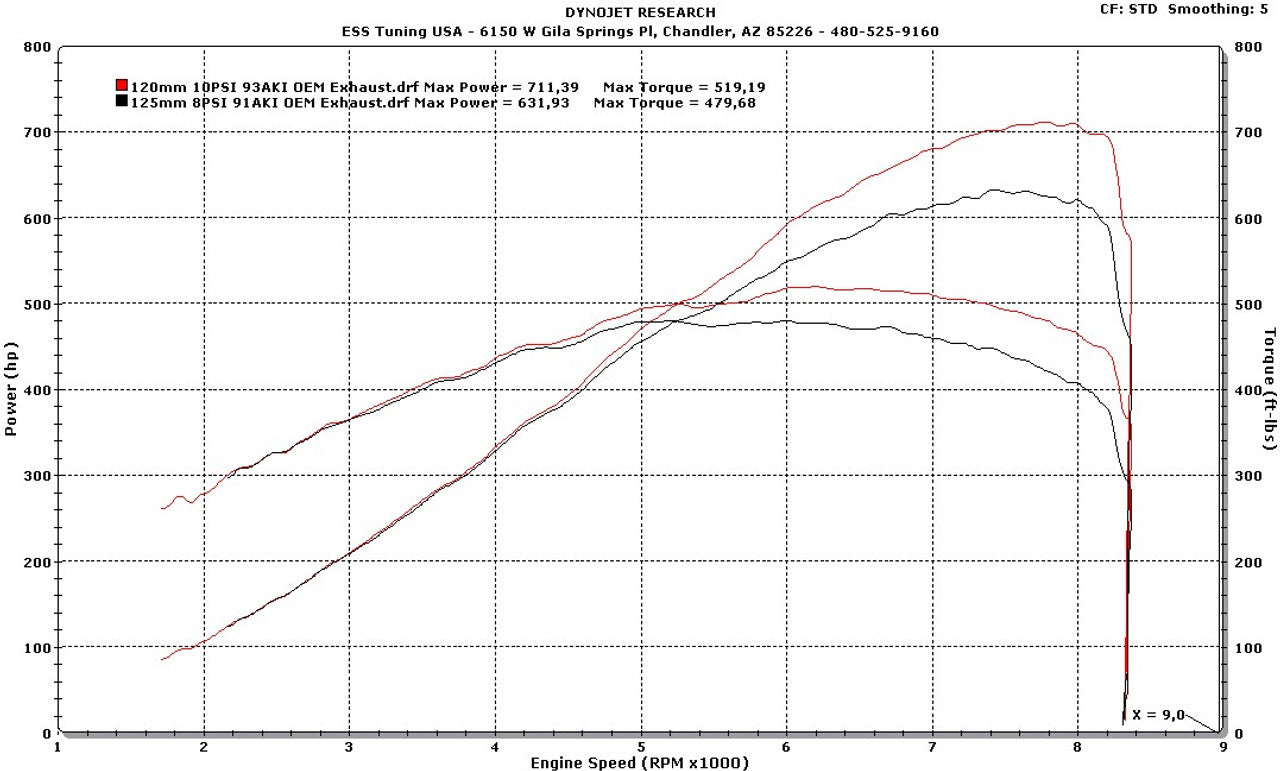 S650 Coyote 125mm/120mm for 91AKI/93AKI. E85 down to 100mm on stock engine (95mm with X-trim).